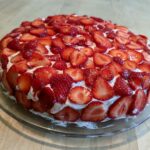Die 2. Biskuit-Hälfte auflegen und die restliche Joghurtcreme aufstreichen und mit Erdbeerstücken belegen.