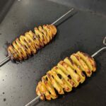 Nun wird die Kartoffel leicht zusammengedrückt und mit einem Spieß der Länge nach aufgespießt. Ist der Spieß durch, kann die Kartoffel fächermäßig aufgezogen werden.