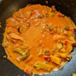 Passierte Tomaten sowie Frischkäse in den Wok geben und weiter köcheln lassen.