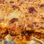 Feuerfeste Form mit etwas Bechamelsauve ausstreichen, dann abwechselnd Nudelblätter, Bechamelsauce, Hackfleischsauce und Parmesan einfüllen.