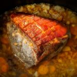 Jetzt Fleisch herausnehmen, die Schwarte karoförmig einschneiden und das Fleisch wieder in die Form legen (Schwarte nach oben!)