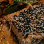 Lachs auf Teller geben und Marinade darüber verteilen, dann mit Sesam bestreuen.